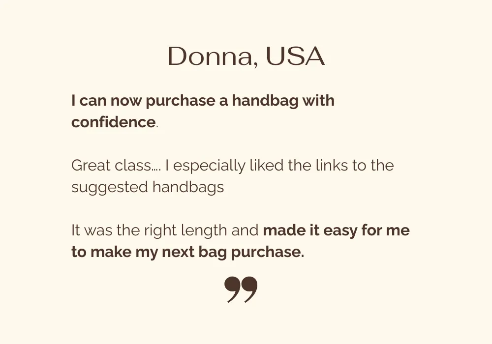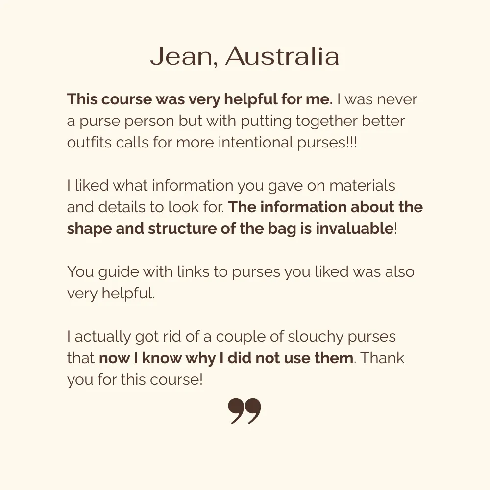 You will be able to judge any bag fast, spot dated and trend signals, and know what works with your real outfits so you stop wasting money